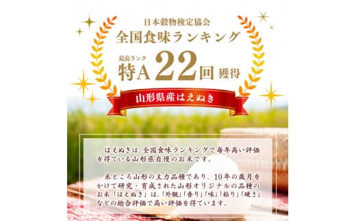 月山の雪解け水が育んだ山形のおいしいお米「はえぬき」は全国食味ランキングで22年連続“特A”にも輝いた山形自慢のお米です。