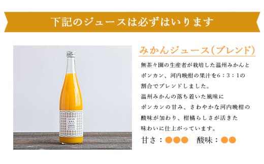定番のみかんジュース(ブレンド)は必ず入りますが、残り3本はその時期おススメの品種を詰め合わせていただきます。