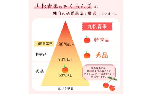 丸松青果ではより良いさくらんぼを皆様にお届けするために、山形県出荷基準よりもさらに厳しい独自の選果基準を設けて、『私たちは「果物」を通じて、感動をお届けしたい。』という理念のもと、安全で美味しい果物を皆様にお届けできるよう努めております。