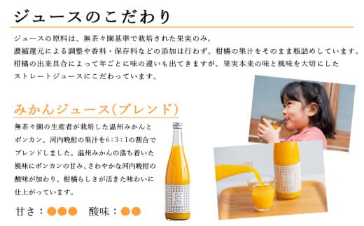 無茶々園の生産者が栽培した温州みかんとポンカン、河内晩柑の果汁を6:3:1の割合でブレンドしました。温州みかんの落ち着いた風味にポンカンの甘み、さわやかな河内晩柑の酸味が加わり、柑橘らしさが活きた味わいに仕上がっています。