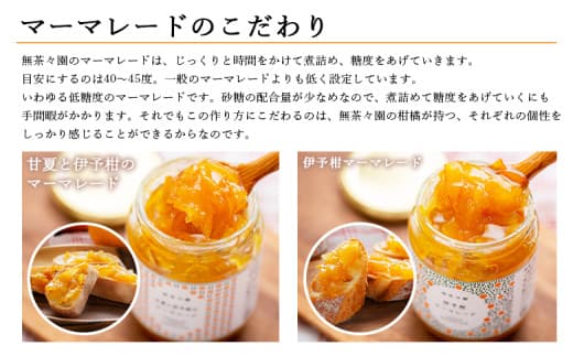 ほろ苦い甘夏の果皮を主原料に、香りの良い伊予柑果汁とサトウキビを加えて煮つめました。果実のしっかりとした風味と粗糖のコクが生きた無茶々園ならではのマーマレードです。