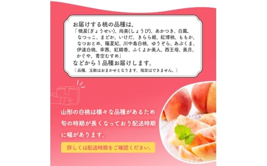 暁星(ぎょうせい)、尚美(しょうび)、あかつき、白鳳、なつっこ、まどか、いけだ、きらら姫、紅博桃、ももか、なつおとめ、陽夏妃、川中島白桃、ゆうぞら、あぶくま、伊達白桃、幸茜、紅錦香、ふくよか美人、西王母、美月、かぐや、青空むすめ などから旬の白桃1品種を厳選しお届けいたします。