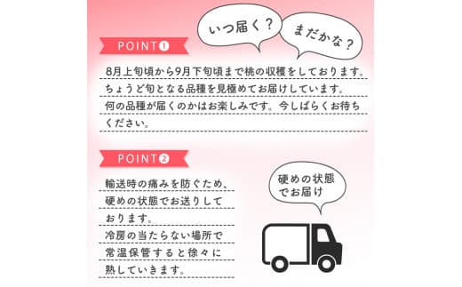 ※桃は輸送中の傷みを防ぐため、硬めの状態で発送いたします。また、輸送中の高温による傷みを防ぐためにクール便での配送に切り替えさせていただく場合がございます。