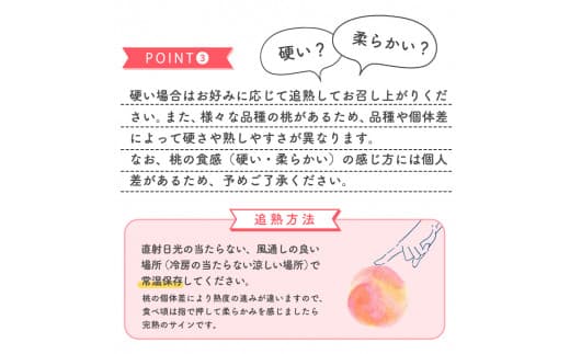 ※柔らかさや熟しやすさは品種によって異なります。また、手で皮がむけるタイプの桃ではございません。