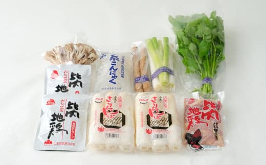 - きりたんぽ6本、比内地鶏スープ400ml(200ml×2)、比内地鶏200g、ごぼう、まいたけ、ねぎ、せり、糸こんにゃく