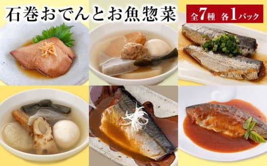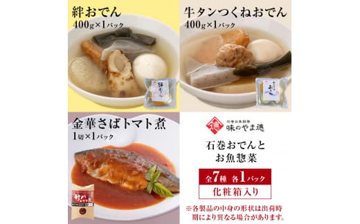 化学調味料無添加「三陸お魚惣菜」と国産の厳選素材で作った「おでん」の惣菜セット!おでん 石巻おでんとお魚惣菜セット 7種セット 各1P 惣菜 常温 牛たん つくねおでん 絆おでん 400g サバ 鯖 金華さば いわし 味噌煮 生姜煮 梅煮 トマト煮 レトルト 常温保存 鯖ダシ 牛タン つくね イワシ さば かつお 宮城県 石巻市 備蓄 保存食 非常食