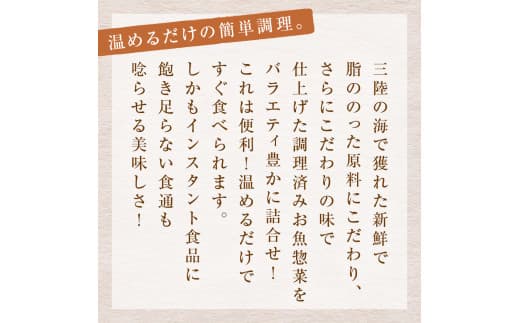三陸の海で獲れた新鮮な魚介の旨みを活かした、化学調味料無添加の優しい味付けのお魚惣菜5種を詰め合わせた、こだわりの惣菜セットです。
