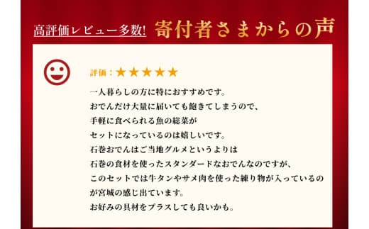 石巻伝統の味わいを堪能できる練り物と国産厳選素材を使った石巻おでん2種と、
