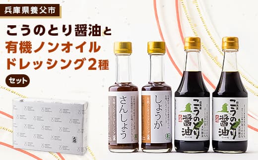 兵庫県豊岡市で、コウノトリとの共生を図り減農薬や環境に配慮した農法でつくった大豆と小麦を100%使用した天然醸造醤油「こうのとり醤油」と、国産有機醤油をベースに有機野菜をたっぷり加えた有機ノンオイルドレッシングをセットにしました。