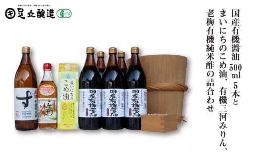 - 国産有機醤油900ml×5 まいにちのこめ油900ml×1 有機本格みりん500ml×1 老梅有機純米酢900ml×1
