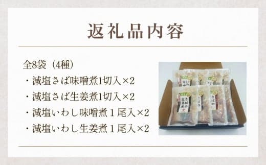 管理栄養士監修!1食当たり塩分0.6g「出汁のうま味」がきいた煮魚4種セット!減塩 煮魚4種・全8袋セット 常温 さば 鯖 サバ イワシ いわし 鰯 味噌煮 生姜煮 惣菜 和風惣菜 和食 魚 お魚 魚介 常温保存 レトルト おかず ご飯のお供 調理済 簡単 温めるだけ 備蓄 保存食 非常食 家庭用 宮城県 石巻市